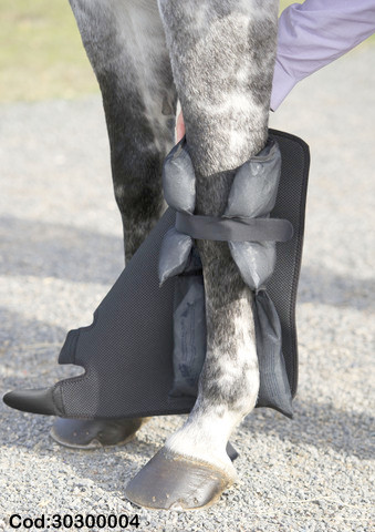 Fácil aplicación, reduce la inflamación, duración apróximada 2 horas; De compresión uniforme y segura, diseñado con materiales especiales que se amoldan y mantienen la temperatura fría evitando quemar al caballo, fuertes velcros asegurando la fijación y firmeza para obtener una óptima aplicación. Sachet reutilizable del freezer al caballo.