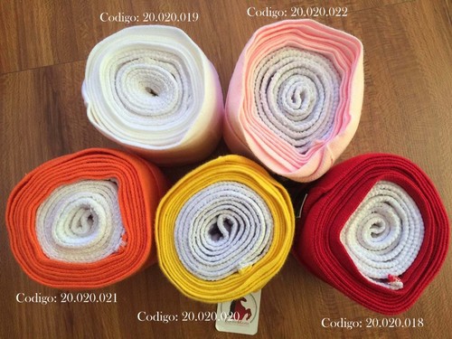 Vendas con paños Acolchonados importados Exelente Calidad, Algodon y poliester con cerramiento Velcro, ideal para protección durante ejercicio evitando lesiones en tendones patas o manos; o para descanso. Set de 4 unidades, colores disponibles: Rojo, Blanco, Amarillo, Anaranjado, Rosado.