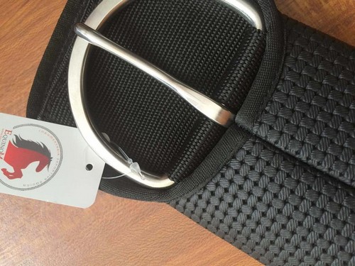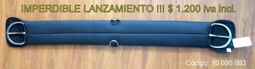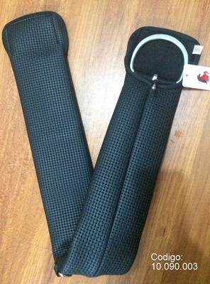 CINCHA DE NEOPRENO NIDO DE ABEJA ANTIDESLIZANTE, NO ABSORVE AGUA, RESISTENTE EN SU INTERIOR REFORZADO CON CORREA DE ALTA DURABILIDAD, SUAVE Y MUY COMODA, IDEAL PARA CABALLOS DE PIEL SENSIBLE, CON HEBILLAS METÁLICAS NIQUELADAS EN AMBOS EXTREMOS CON PROTECCIÓN Y AROS METÁLICOS PARA ACOPLES DE PECHERAS O ACCESORIOS. LAVABLE DE FÁCIL MANTENIMIENTO. SE PUEDE USAR CON CORREONES DE CUERO O DE CINTA CON OJALES. MEDIDADAS: 90 CM DE LARGO POR 10 CM DE ANCHO. PESO: 770 GRAMOS. COLOR NEGRO.